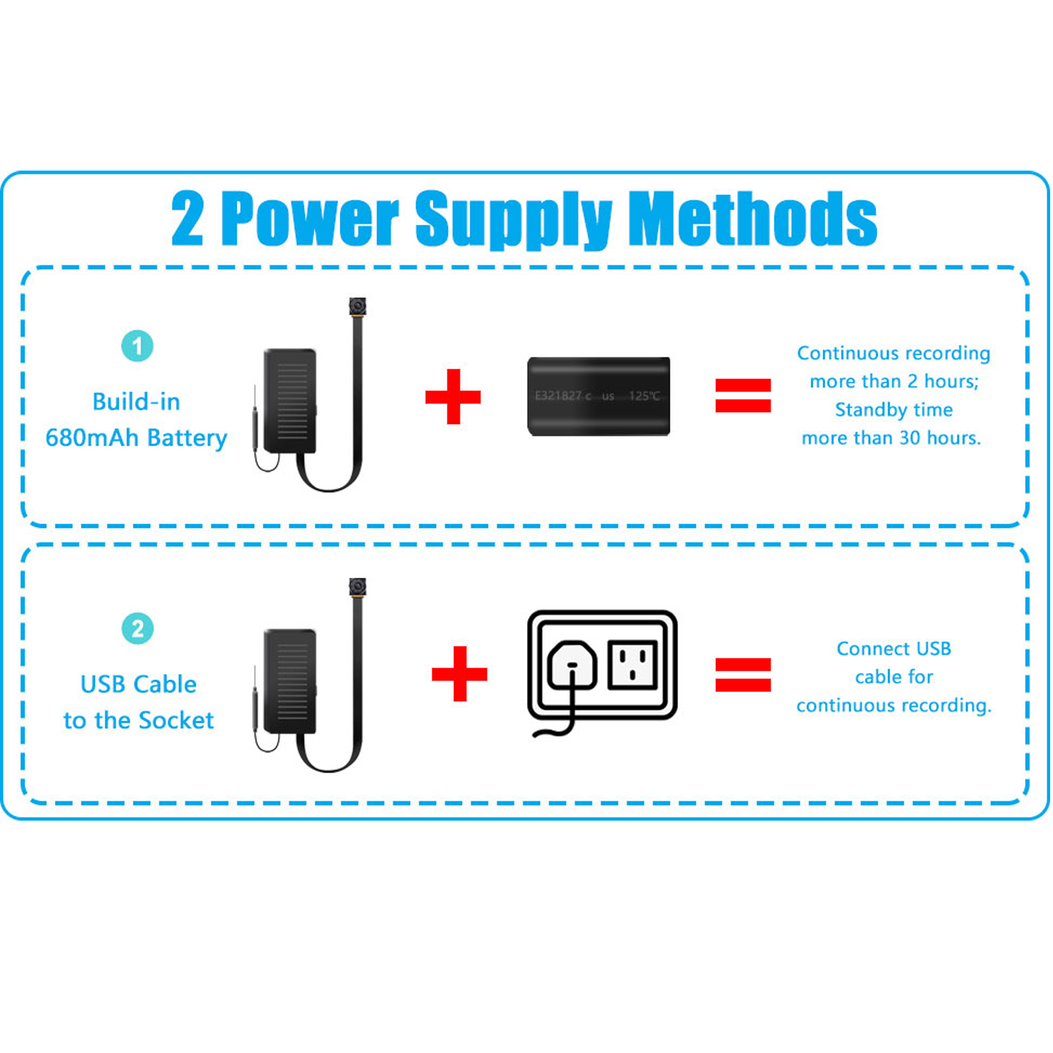 —2 power supply methods for this hidden camera- The 680mAh battery chargeable can support the small spy camera continuous recording
