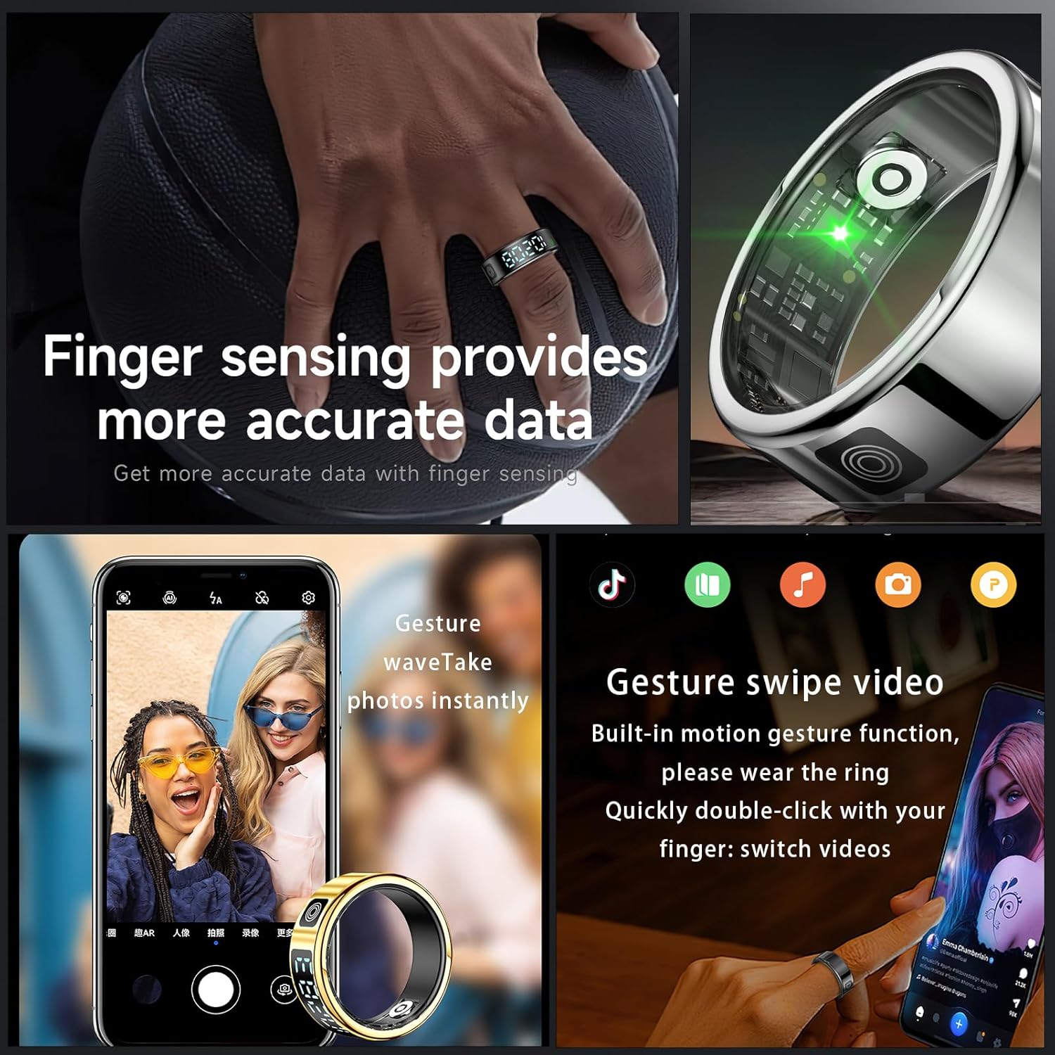 Gesture Control for TikTok & Remote Photography:Our smart rings include a remote camera function, enabling users to control their mobile phones to take photos remotely. Enjoy easy control with air gesture functionality. Simply wear the health rings for men and use gestures to browse TikTok, take photos, turn pages in e-books, and navigate through apps, this sleep tracker ring allows you to enjoy a more convenient interactive experience